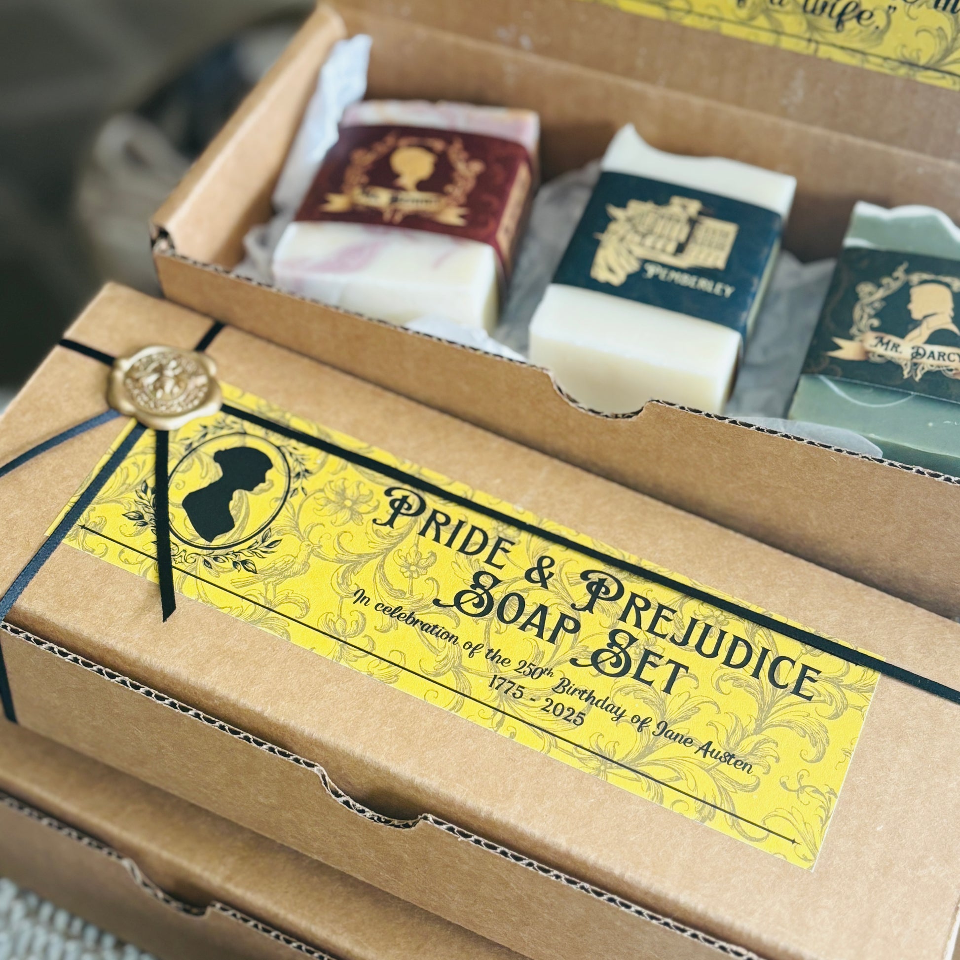 In celebration of Jane Austen’s 250th birthday, our limited edition soap set features Mr. Darcy, Miss Bennett, and Pemberley soaps, beautifully packaged and finished with a wax seal. Perfect for the Austen fan in your life!
